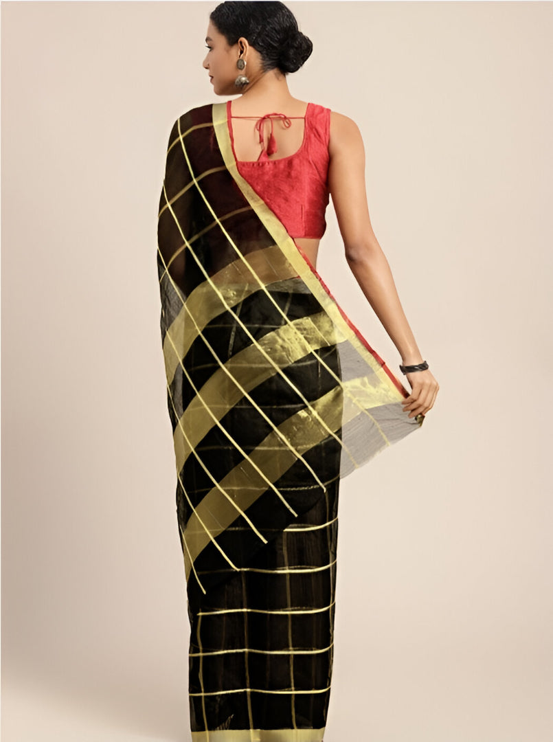 Kota Cotton Blend Saree Black Gold Woven Border Zari Work with Blouse Piece